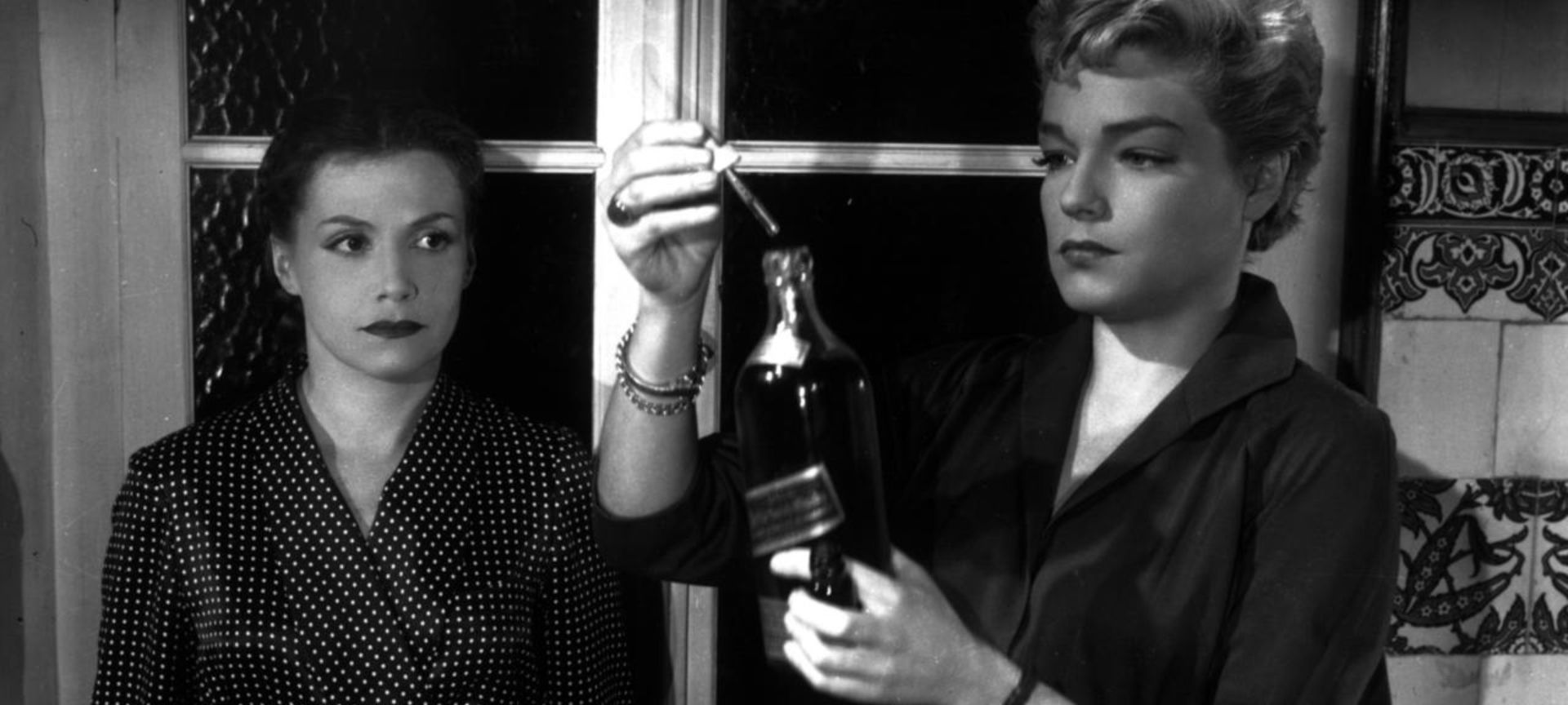 The dramatic plot twists in LES DIABOLIQUES gave the film its own exhibition gimmick in the form of on-screen request not to give away the ending and a box office policy — adopted in some locations — of enforcing “no late admission” so as not to spoil the build up of tension (gimmicks Hitchcock copied for PSYCHO). Polite notice: We are showing LES DIABOLIQUES in its original French language with English subtitles.